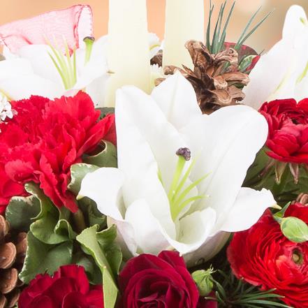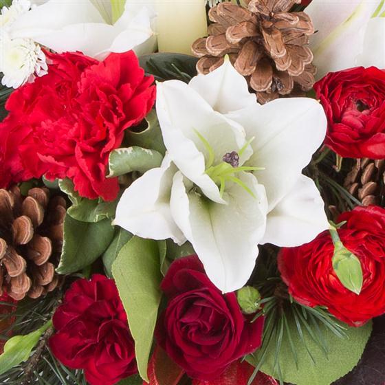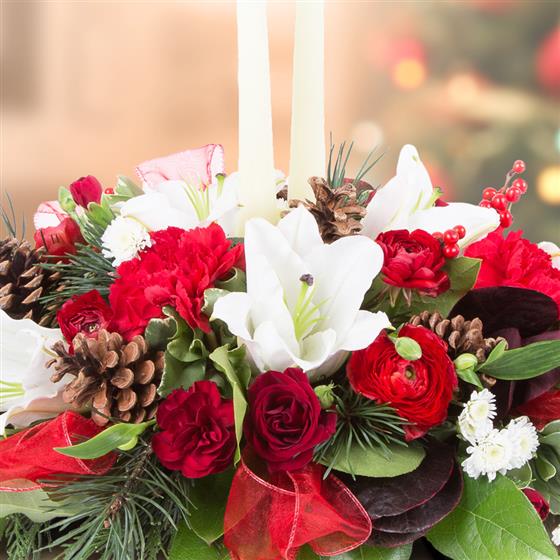 A beautiful, traditional table centre with florist choice seasonal flowers and decorations.