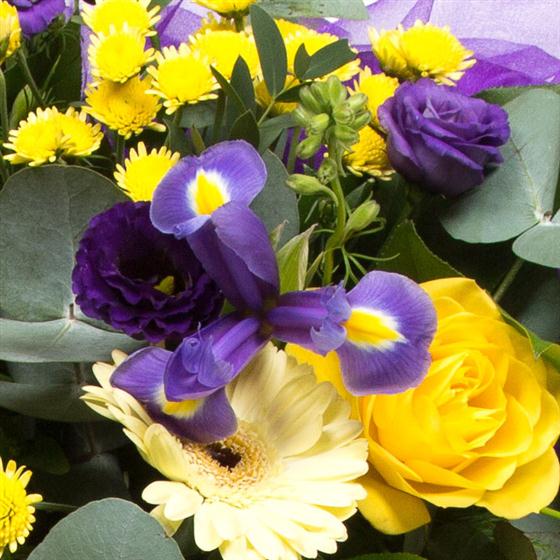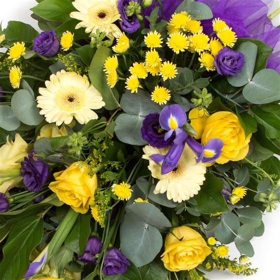 A colourful hand tied tribute of seasonal blooms in shades of purple and lilac with contrasting golds and lemons.