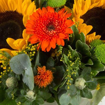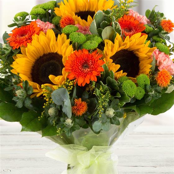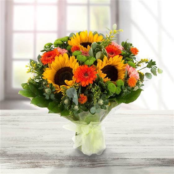 Sunflowers are the focal point of this dazzling, citrus hand-tied bouquet. To avoid disappointment please contact os to confirm sunflower availability.